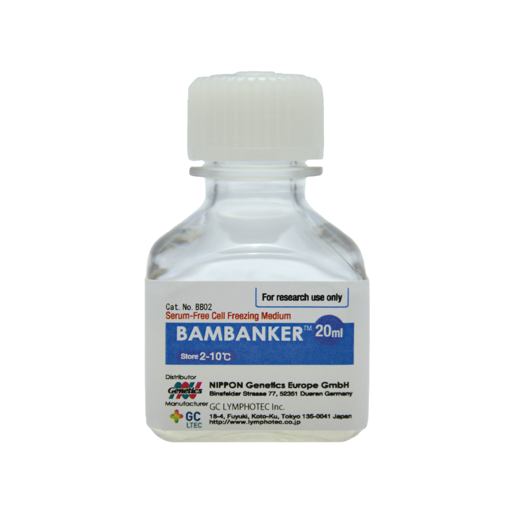 The cell freezing media Bambanker™ permits cryopreservation of cells at -80°C (or in liquid nitrogen), obviating the need for an additional and expensive ultralow freezer and avoiding time consuming and complicated controlled freezing protocols. Simply (1) harvest cells, (2) aspirate medium, (3) resuspend in Bambanker™ (4) transfer to a cryovial and (5) store at -80°C. No programmed or sequential freezing is required! Bambanker™ is a serum-free cryopreservation medium that is delivered ready-to-use and can be kept in the refrigerator for up to two years. Convenient 20 ml bottles are available, making Bambanker™ freezing medium ideal for use by individual members of your lab. Today this innovative cell freezing medium Bambanker™ is the market leader in Japan and characterized by many different published articles with very sensitive cell lines all over the world.